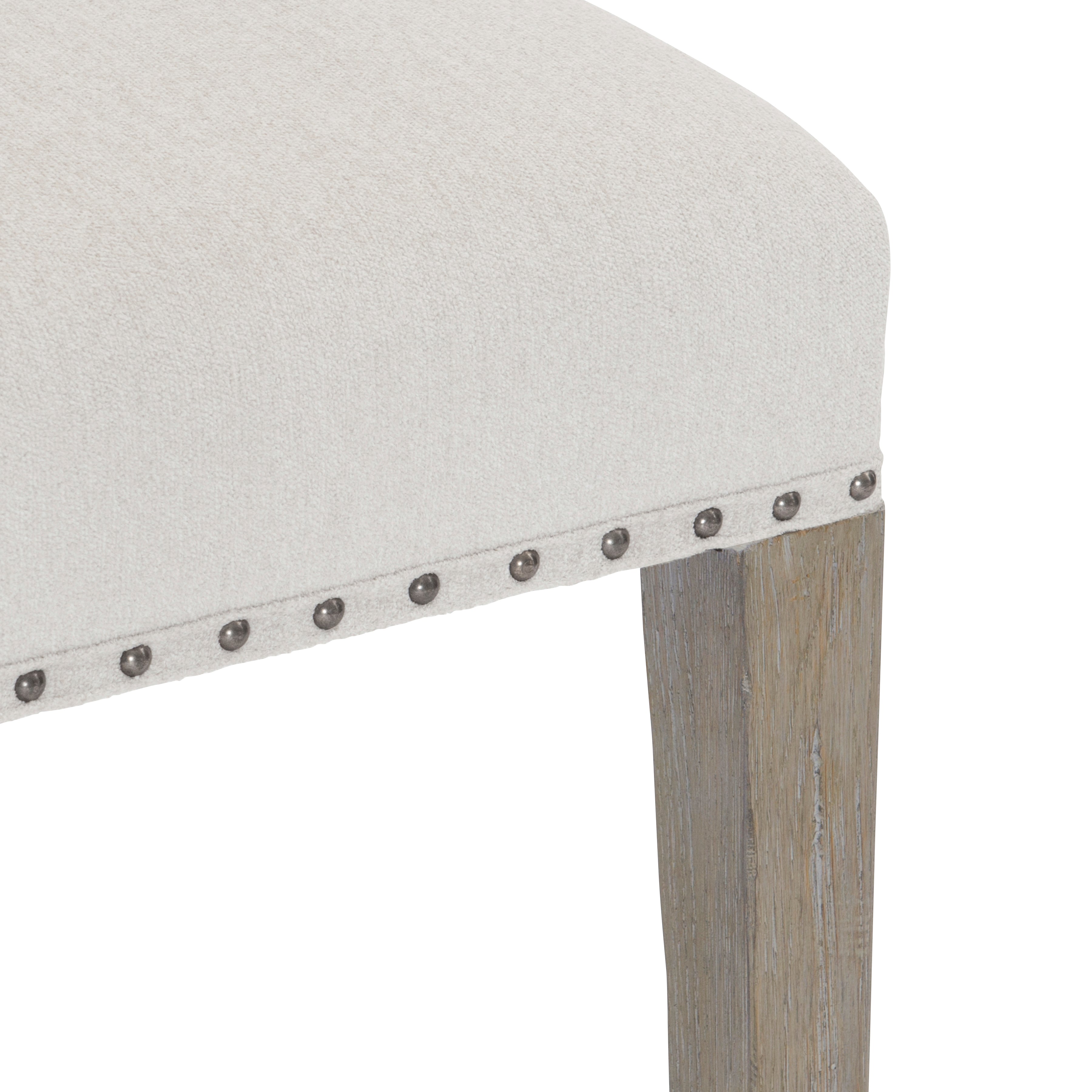 There are traditional details in the Albion side chair, with the wood frame, nailhead trim, and upholstered seat and back. But the sleeker tapered legs and the open back styling take this familiar style into a new direction for a more current outlook. The Pewter finish and wire-brushed white oak put the finishing touches on a gorgeously modern rustic form.