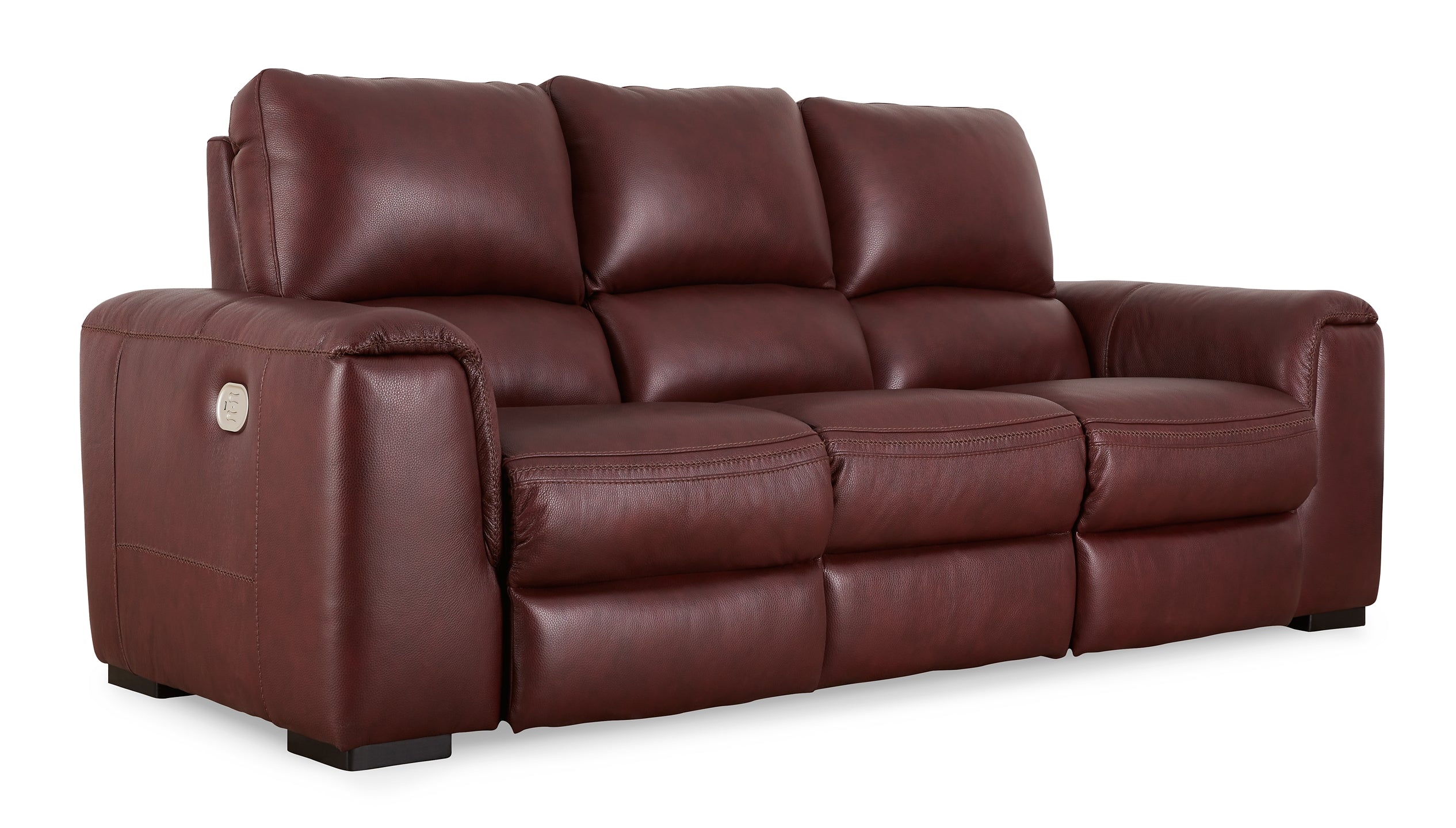 Impressive in scale while keeping an air of refinement, this power reclining sofa stuns with soft, supple leather match upholstery in garnet. Sink into the seating area and cater to your comfort with one-touch power reclining and an adjustable headrest. Complete with USB charging, this sofa makes a surefire statement in your contemporary living room.