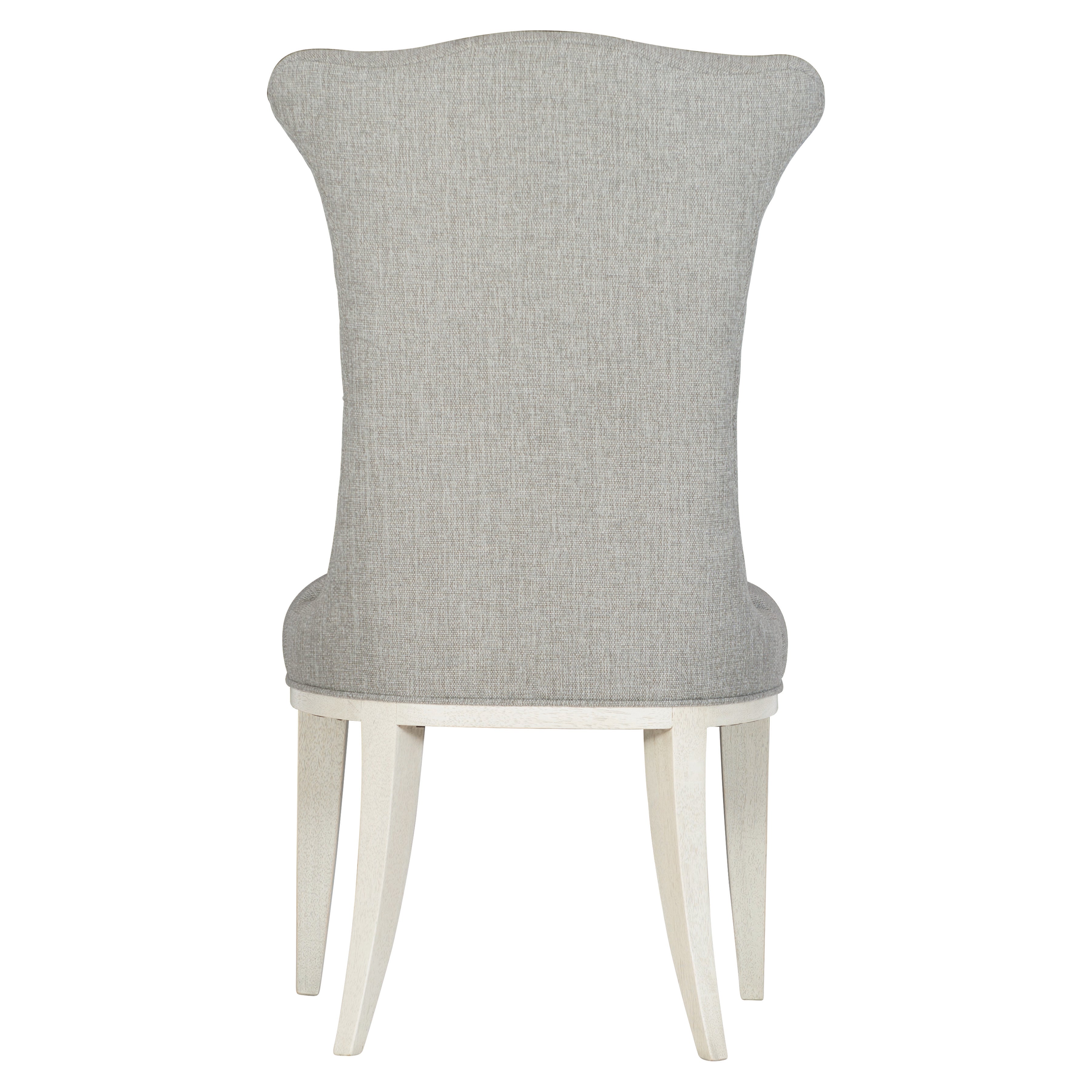 Taking a modern approach to Neoclassicism, the Allure dining chair gives a formal silhouette a soft, understated look. The button-tufted high back evokes the grandeur of Louis XVI furnishings. Finished in Manor White with silver highlights, the exposed wood frame features tapered legs in the front and elegant saber legs in the back.