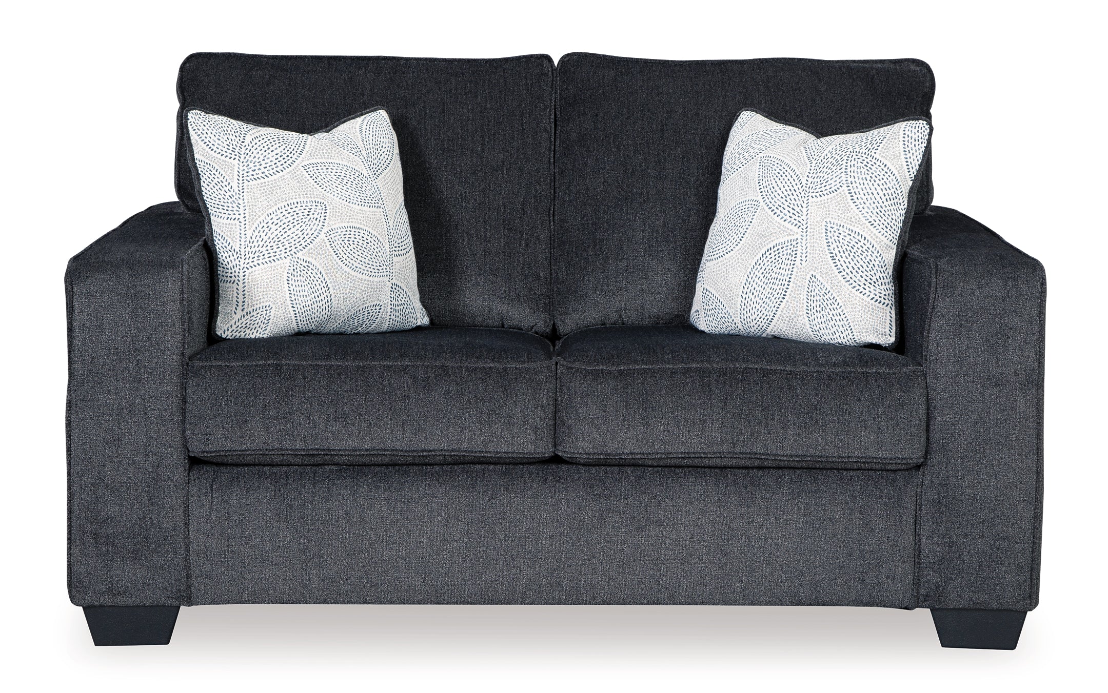 If style is the question, then this loveseat is the answer. Sporting clean lines and sleek track arms, the decidedly contemporary profile is enhanced with plump cushioning and a chenille-feel upholstery that's so pleasing to the touch. Sure to play well with so many color schemes, this loveseat in slate gray includes a pair of understated floral pattern pillows for fashionably fresh appeal.