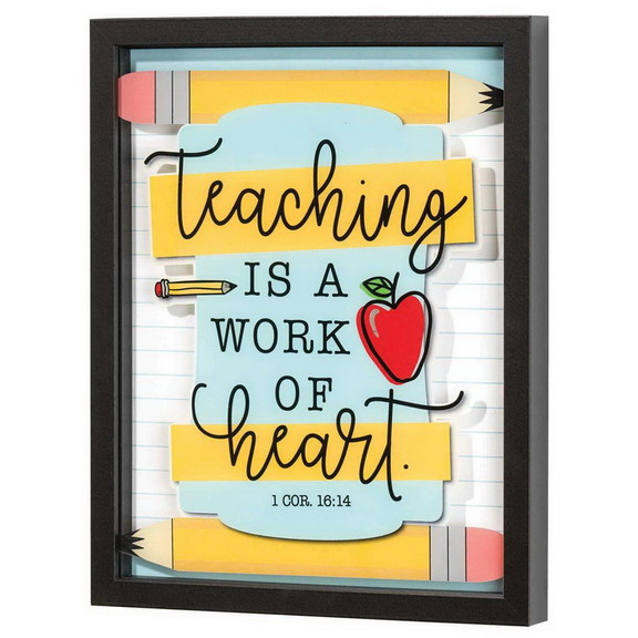 Teaching is a work of heart. These words, along with 1 Cor. 16:14 verse reference, are featured on this lovely wall decor piece that makes a thoughtful gift of appreciation for that special teacher. Design is on the underside of the glass, which is set 3/4in above the notebook paper look background print. Black shadow box style frame has pull-out easel plus metal hanger on back to allow tabletop or wall display. Glass and print are 11 x 14; outer frame size is 12 x 15 x 1 1/4. Frame is MDF wood.