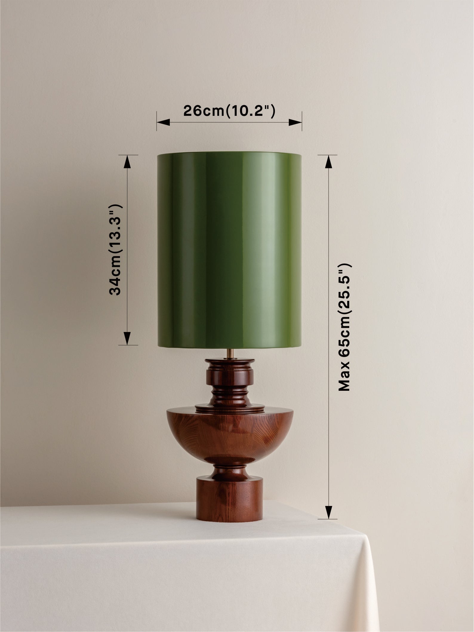 This combination comprises of: Base = Solid spun wood base, Shade = Expertly coated with a deep green lacquer.