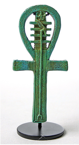 - the Ankh cross with open eye symbolizing eternal life. The square medallion in the opening depicts the god Heh.