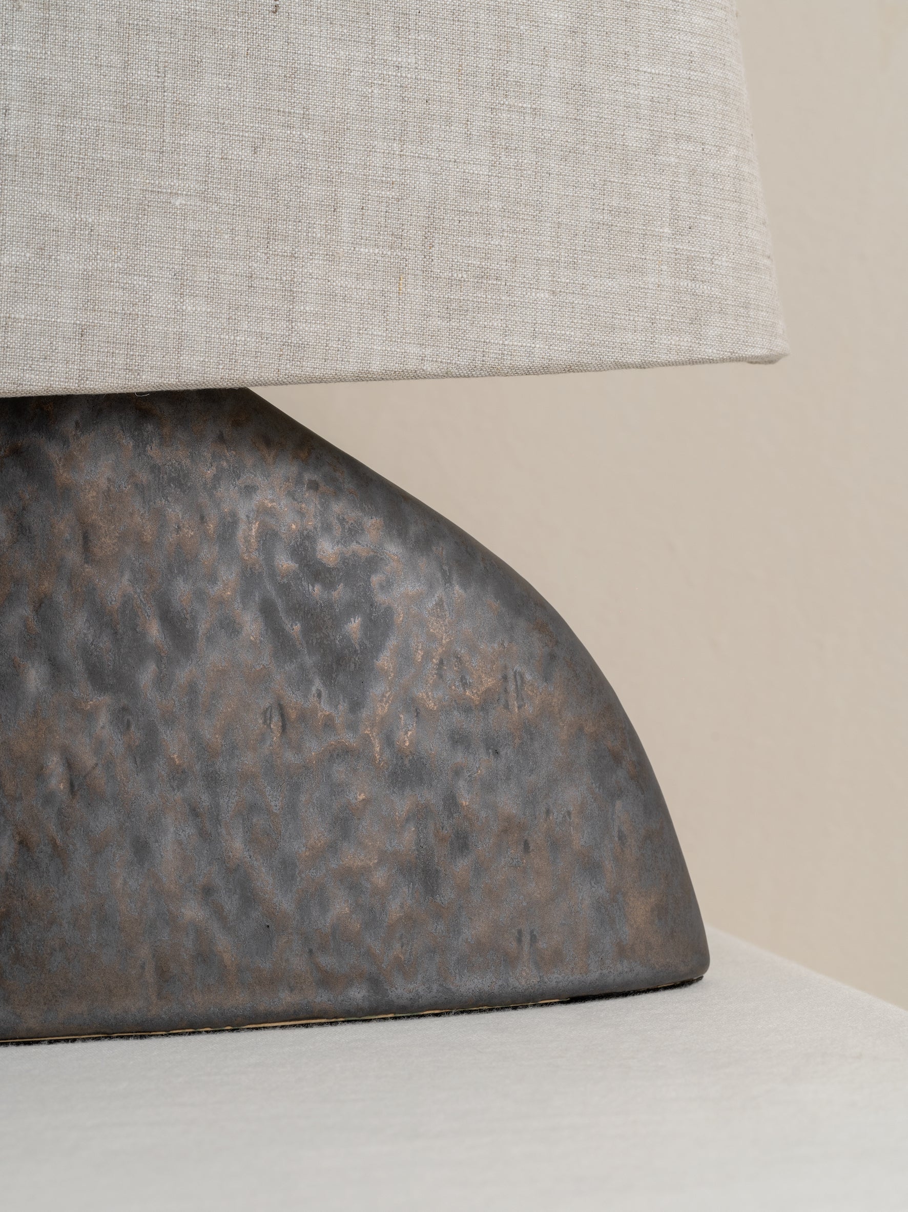 Simplistic yet extraordinary. The Pitti table lamp is a celestial masterpiece that channels the wonders of the cosmos. Featuring a sinuous bronze ceramic base and complemented with a symmetrical linen shade to diffuse an ambient glow.