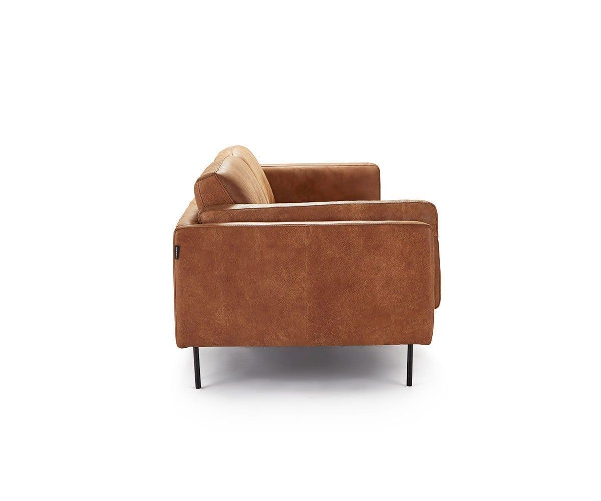 Luxuriously upholstered in a solid panel of soft leather, the Rehan Sofa features contemporary Italian design. Streamlined decorative cushions act as added comfort, while contrasting black metal legs provide a clean finishing touch.