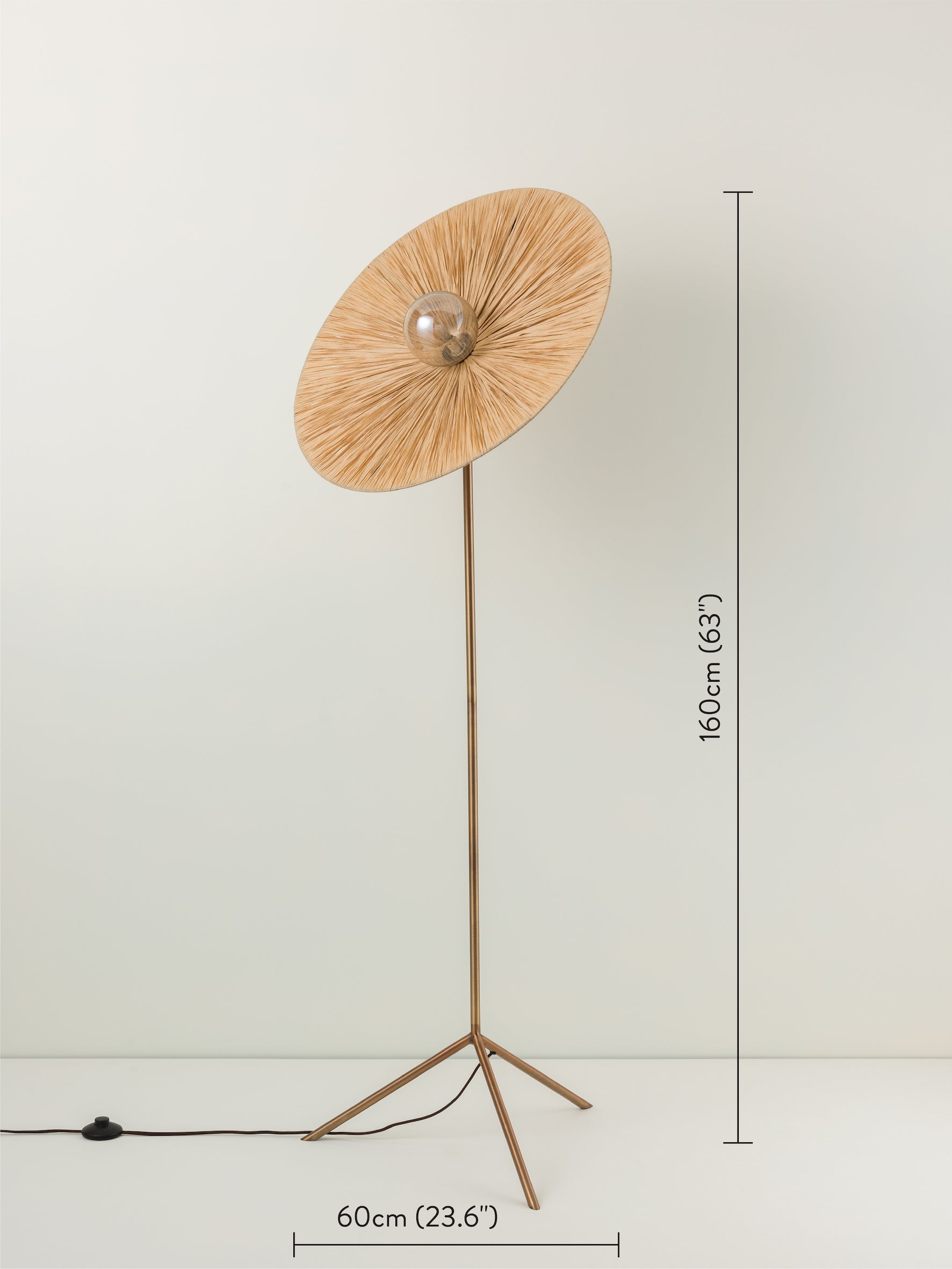 Distinct, ecliptic, retro. Inspired by 1970s furniture design, Ridotti floor lamp has layers of hand woven natural raffia that create a soft and textural oversized disc that diffuses the light beautifully. The smooth central bubble glass globe diffuses a soft ambient light that reflects the warm golden hues of the raffia. The burnished brass single stem body and tripod base ensure maximum stability for this statement floor lamp. The oversized disc pivots on the stem to allow you to direct the light. Great for lounges, garden-rooms or even bedside. Bubble glass globe ball included but G9 bulb is not included.