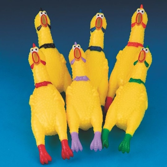 Safe, soft, squeaking chickens are super silly and fun to use in any parachute or tossing activity. Latex-free chickens are molded from hollow vinyl. Sets of 6, 1 each of 6 different accent colors. Small chickens are 6-1/2"L. Medium cows are 7"L.